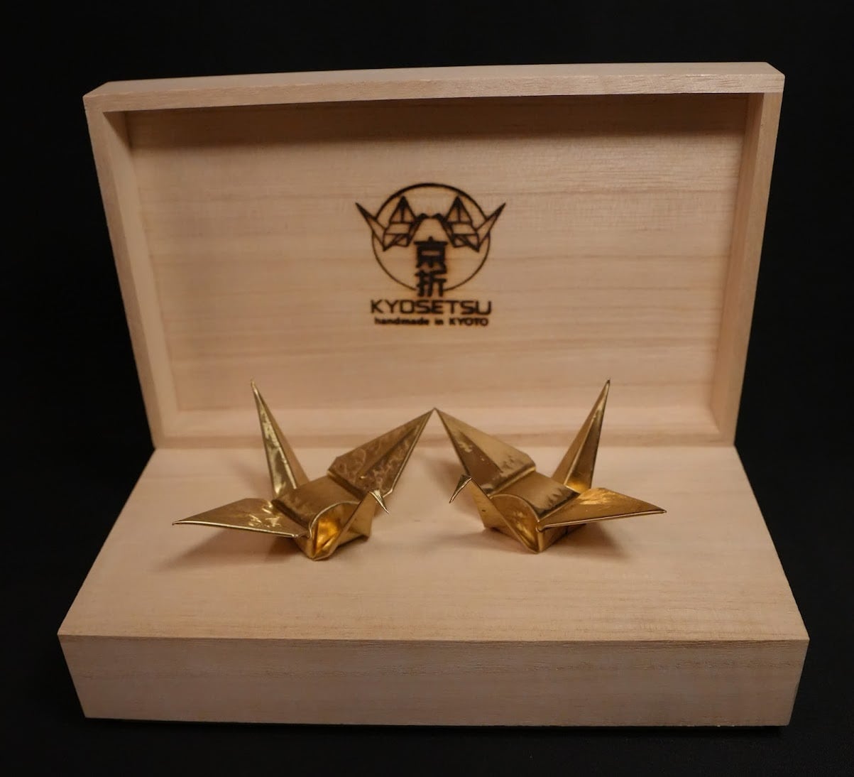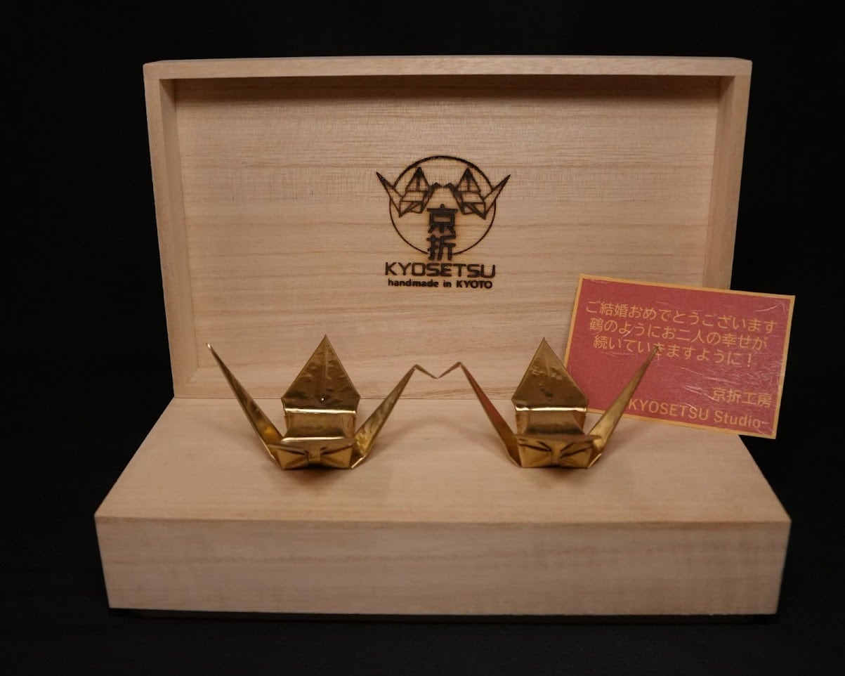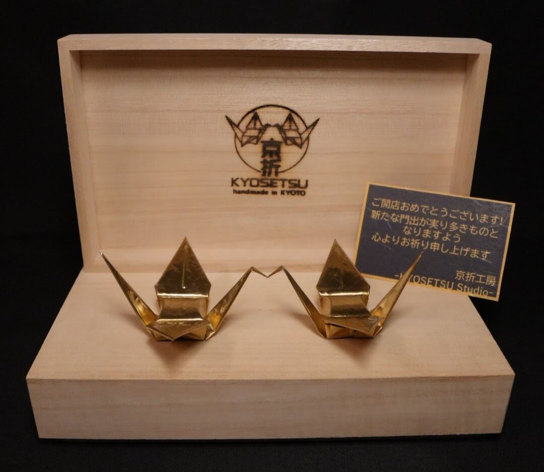 京都の職人が一枚の真鍮板を手打ちで模様をつけからすべて手作業で折り上げた特別な折り鶴です。