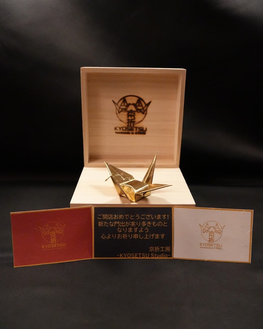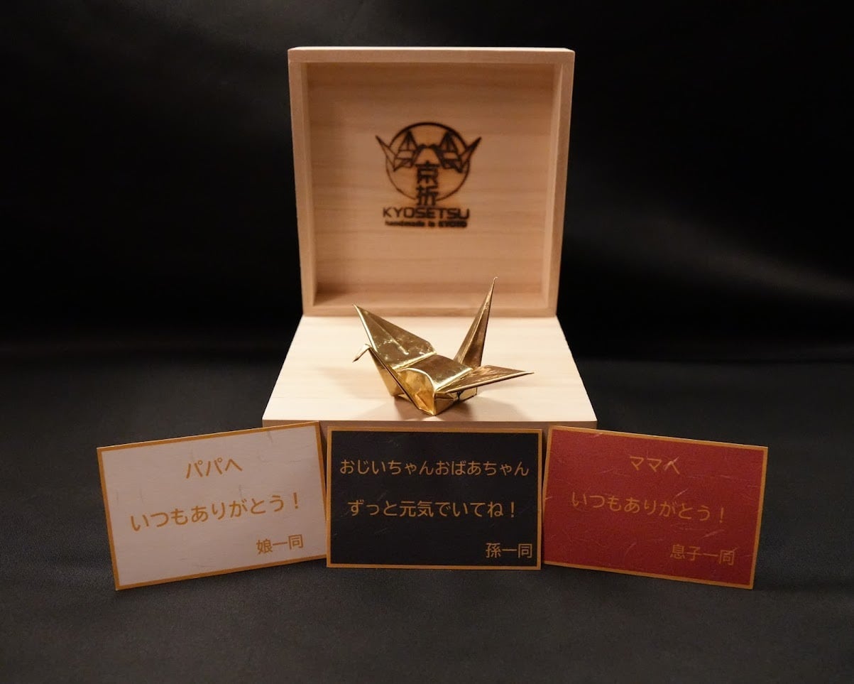 京都の職人が一枚の真鍮板を手打ちで模様をつけからすべて手作業で折り上げた特別な折り鶴です。